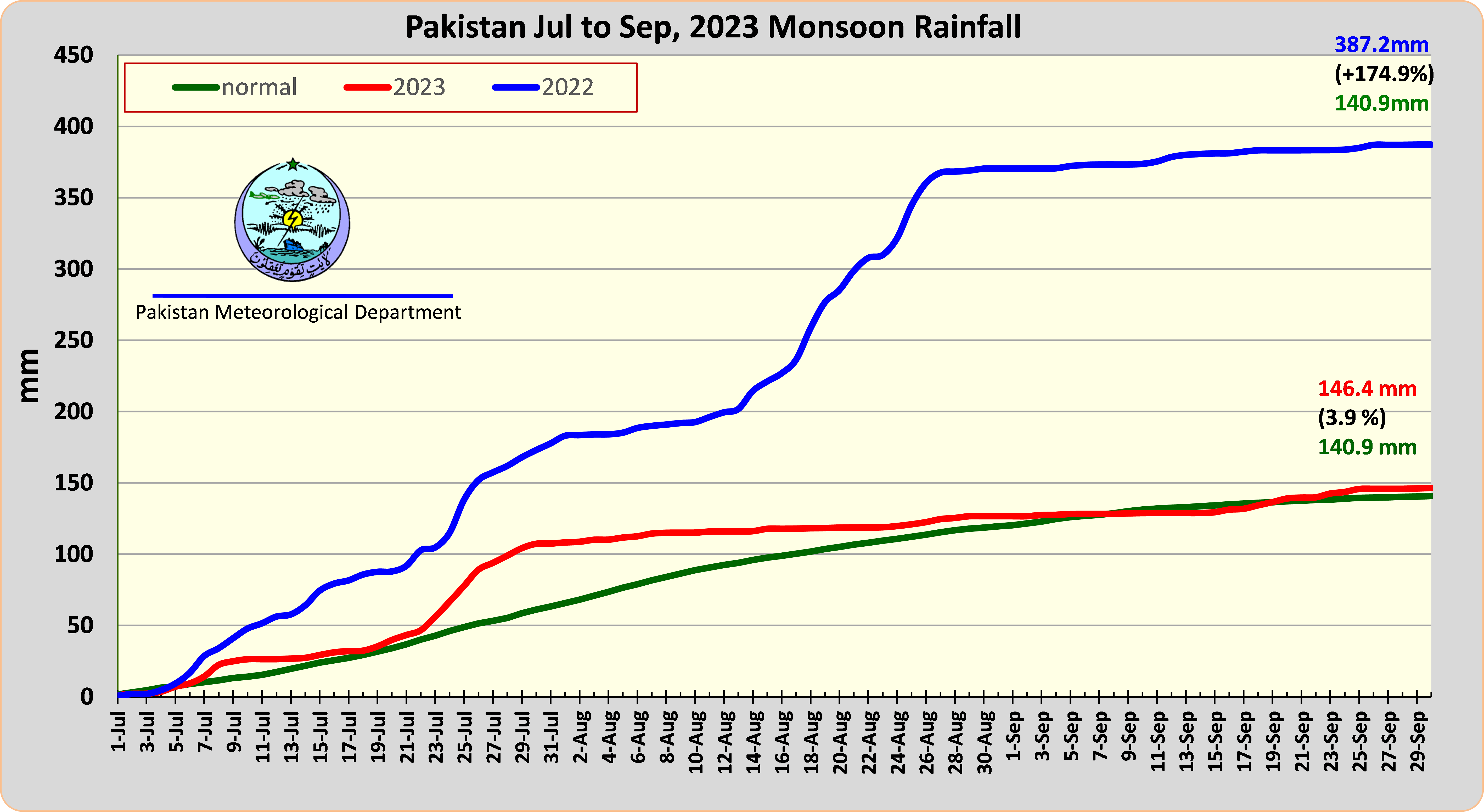 The monsoon season in Pakistan this year began on July 3, 2023, which was two days later than its usual start date of July 1. However, there was a significant monsoon rainfall during the month of July, followed by a sudden decline in August 2023. September 2023 saw near-average rainfall.