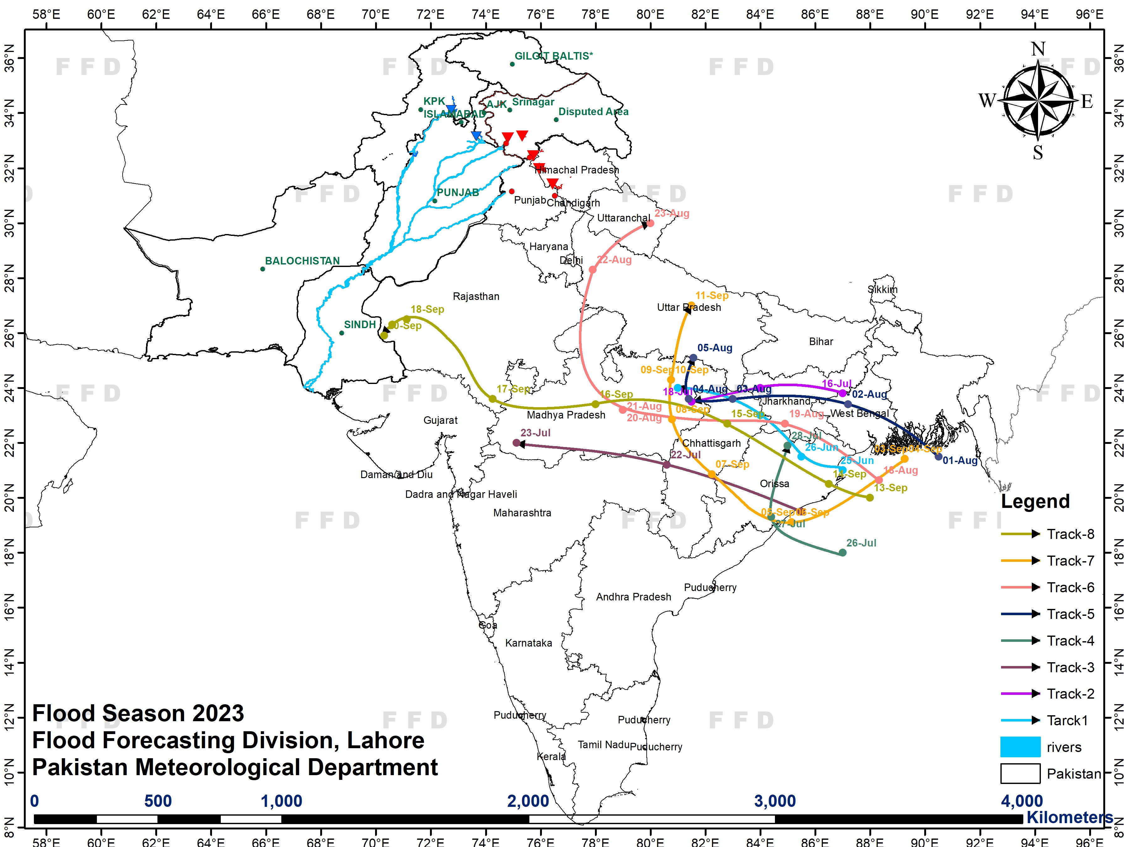 - Tracks of several low-pressure areas (LPAs) are shown in Figure 3 (with five low-pressure areas (LPAs) moved in during the July with heat-low of average pressure 992hPa persisted over Northwest Balochistan. During August the two LPAs moved over the country with increased heat-low average pressure 994hPa persisted over North-northwest Balochistan. Whereas, only one LPA entered in September with heat low average pressure of 996hPa.